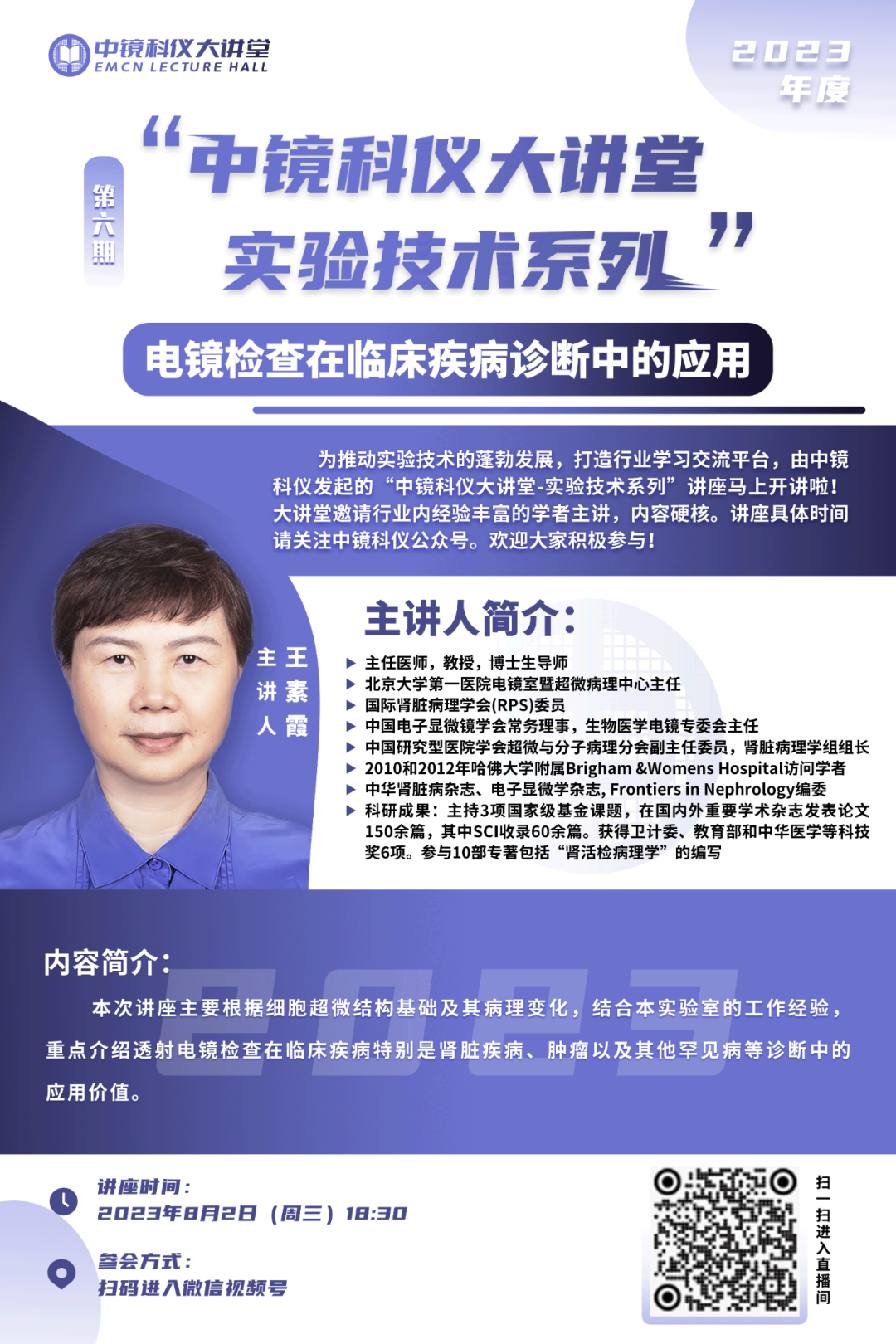 中鏡科儀大講堂-實驗技術系列視頻回放 第六期:電鏡檢查在臨床疾病診斷中的應用 為推動實驗技術的蓬勃發(fā)展,打造行業(yè)學習交流的平臺,由中鏡科儀發(fā)起的2023年“中鏡科儀大講堂”第六期-“實驗技術系列”講座圓滿結束!電子顯微鏡技術作為現(xiàn)代醫(yī)學領域的重要工具,在病理診斷中發(fā)揮著不可替代的作用。本期特邀王素霞教授為我們帶來了《電鏡檢查在臨床疾病診斷中的應用》的專題講座。本次講座結合實例深入分析了電鏡在基礎醫(yī)學和臨床診斷、常見組織器官的正常超微結構及病理改變等方面的應用。內(nèi)容詳實,深入淺出,精彩非凡!現(xiàn)將本期講座回放發(fā)布,供大家學習,歡迎大家觀看!